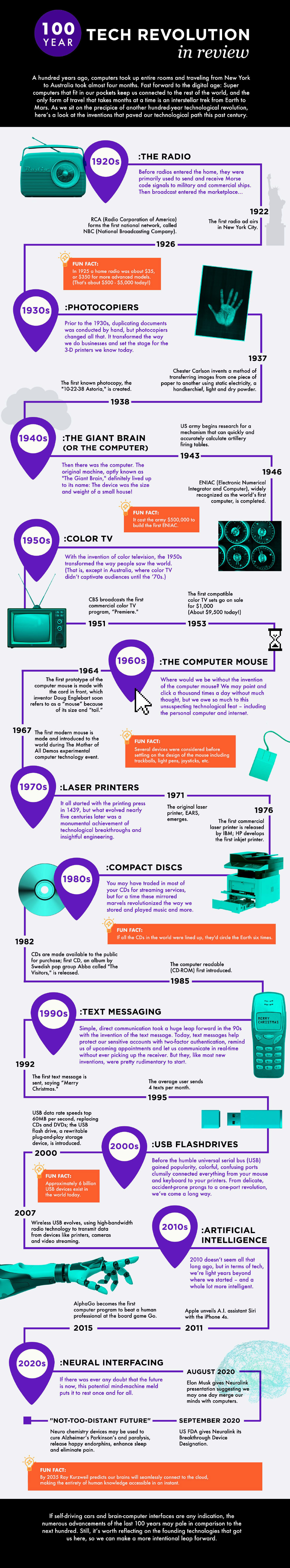 From the humble home radio to pocket-sized artificial intelligence, the last 100 years have been a technological whirlwind. Now as mind and machine prepare to merge, we look back nostalgically. See the infographic here: